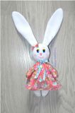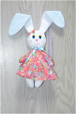 Зайка выполнена из флиса (голова, ушки, ноги, хвостик), хлопка (ушки), вискоза и фатин (платье). Рост примерно 30 см (вместе с ушками =50 см). Глазки и носик из пластика - приклеены. Ротик нарисован акриловой краской.