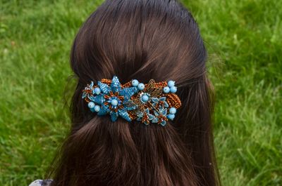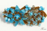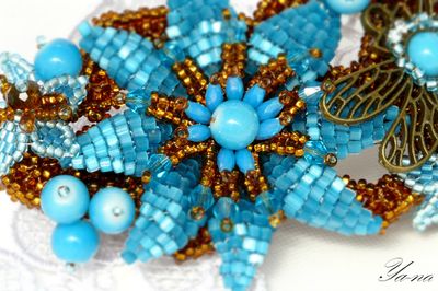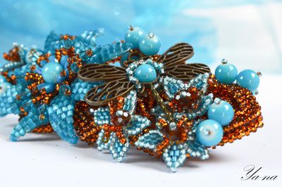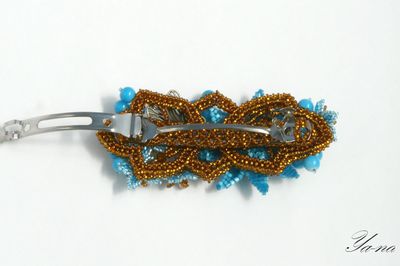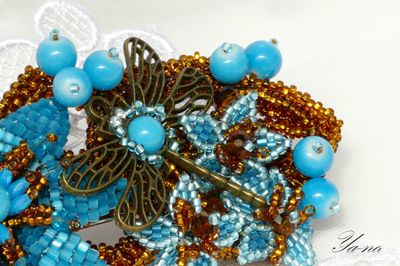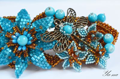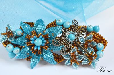 Крупная заколка из бисера с фантазийными цветами, ягодами и стрекозой, в бирюзово-голубой гамме, необыкновенно украсит вашу прическу. Заколка сделана в единственном экземпляре, смогу сделать повтор только по мотивам. Крупный цветок сплетен из шелковой винтажной рубки глубокого цвета, создается ощущения свечения. Держит волосы очень хорошо. Мои 4 пальца выдерживает без труда. Отличный аксессуар, оригинальный подарок для любимой и на любой случай. Размер: 12 см в длину, 5 см в ширину. Материалы: Японский бисер, чешский бисер, сатиновая рубка, металлофурнитура, бисины стеклянные, хрусталь