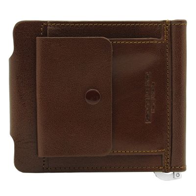Зажим для денежных банкнот из натуральной кожи. Ручная работа. Cнаружи отделение для мелочи (на кнопке). Размеры: 9 х 8,5 см Материал: натуральная кожа Цвет: корчневый (Tan)