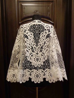сплетен на коклюшках в технике "Елецкое кружево" Длинный рукав с расширением к низу .На жакете сказочные цветы легко и естественно сплетаются в сложные тропические узоры. Дополнение в виде плотной графической сетки только подчеркивает многообразие узоров кружева, а белый цвет придаёт торжественность и благородство.
