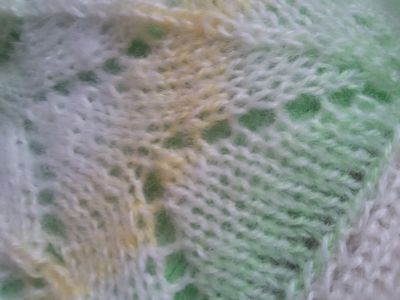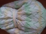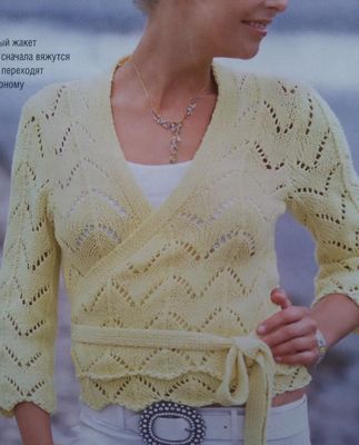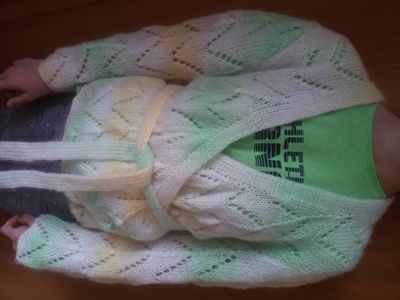 Просторный комфортный жакет с запахом из мягкой воздушной пряжи с содержванием мохера немецкого производства (35% мохер, 65% акрил). На полочках вывязаны завязки, которые служат поясом, рукава 3/4. Цвет нежно-зеленый и желтый плавно переходят друг в друга. Размер 46
