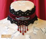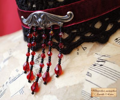 Вязаное кружево ручной работы (100% мерсеризованный хлопок), штамп в виде летучей мышки (про-во США, латунь, посеребрение, оксидирование), бархатная лента, бусины-капли от Swarovski, биконусы из чешского хрусталя, чешский бисер Preciosa. Завязывается на 2 широкие атласные ленты. Высота 6,5 см, на обхват шеи от 27,5 см. В 1 экземпляре!