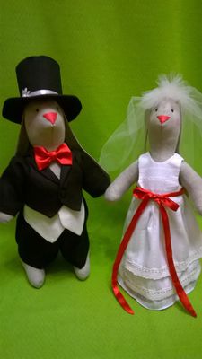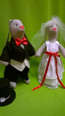 Жених и Невеста - влюбленные зайчики. Он- в жилетке, брюках и смокинге, на голове цилиндр, Она - в свадебном платье. Игрушки могут стоять и сидеть самостоятельно. Одежда полностью снимается. Рост зайчиков 35-37 см