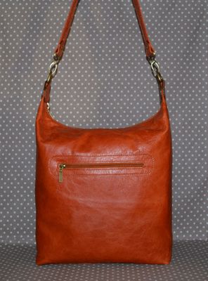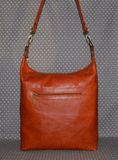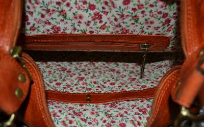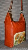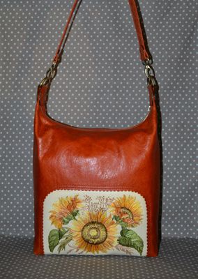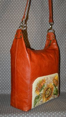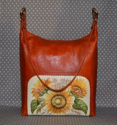 Повседневная женская сумочка, сшита из натуральной кожи ярко-рыжего цвета, с очень интересным крэш эффектом Украшена сумочка машинной вышивкой. Дизайн вышивки Натальи Шестаковой. Сумочка имеет одно отделение и четыре кармана - один на тыльной стороне сумочки и три внутри ( один на молнии и два открытых) Подкладка цветной хлопок. Ручка крепится к сумке при помощи карабинов. Застегивается сумочка на пластиковую молнию Донышко хорошо уплотнено, не прогибается. Фурнитура цвета состаренной латуни. Размеры сумки: ширина от бокового до бокового шва - 37 см, высота 31 см, донышко 25 х 9 см, ручка - 65 см.