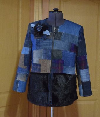Стильный жакет для уверенной в себе женщины. Выполнен из джинсовых, кашемировых, шерстяных, смесовых тканей в стиле бохо в технике лоскутное шитьё и стёжка по синтепону. Мех - норка, застёжка - молния, шёлковая подкладка. Съёмная брошь из меха и ткани. Есть внутренний карман. Размер 48
