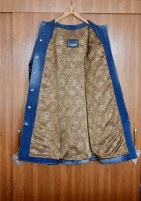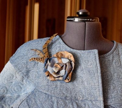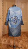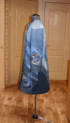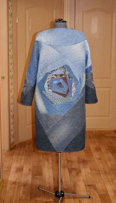 Стильное пальто-бохо выполнено в технике лоскутное шитьё и стёжка по синтепону из джинсовых, х/б, льняных, кашемировых тканей. Брошь-цветок из ткани и перьев фазана съёмная. Застёжка на кнопки, в боковых швах карманы застёгиваются на кнопки. Подкладка шёлковая. размер 48-50
