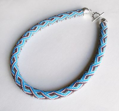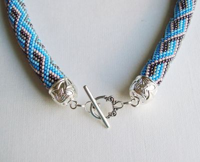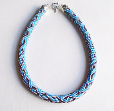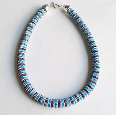 Жгут из бисера Морская коса - это необычное, двух стороннее колье, выполненное в технике вязание из качественного чешского бисера на хлопковой нити "canarias". Концы жгута оформлены металлической фурнитурой светлое серебро, замок тогл - надежен и удобен. Длина изделия с замком 52 см., в том числе вязаная часть 45 см. Диаметр жгута 13 мм.