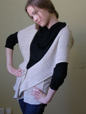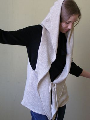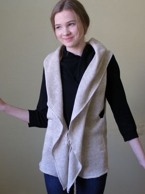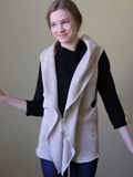 Льняной жилет натурального цвета. Комбинирование материалов. Спинка- льняная ткань, перед и капюшон связаны на машине. Пряжа- итальянский лен. Длина по спинке 63 см, глубина проймы-35см. Размер 42-48. Главное украшение-большой капюшон (40см) с кисточкой. Отделка-шнур, связанный на мельничке. Незаменимая вещь на отдыхе, оригинально и стильно для работы. Авторская модель.