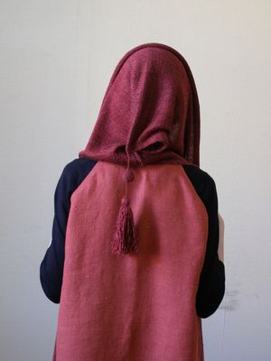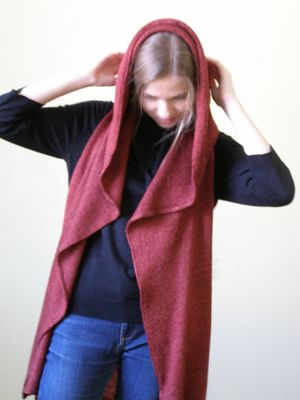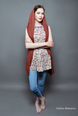 Жилет- хит весенне-летнего сезона 2016г. Выполнен из натуральных материалов: пряжа лен, Италия, ткань- лен г. Кострома. Отличная комбинация машинного вязания и ткани. Размер универсальный 42-50. Длина по спинке 80 см. Большой роскошный капюшон может выполнять роль пелерины, украшен длинной кистью.
