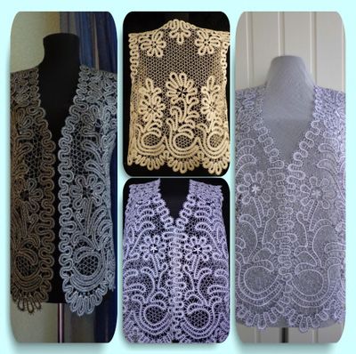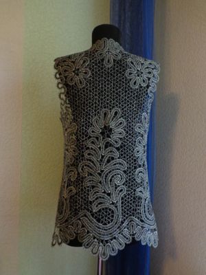 сплетен на коклюшках в технике "Вологодское кружево" Жилет классического покроя с рисунком содержащим цветочный орнамент. Возможны любые цвета и размеры на заказ. На фото 3 варианта цвета:1.цвет "Светлое серебро"2. цвет "Черненое серебро"3. цвет"Бежевый"