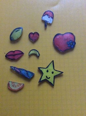 Значки из пластика,раскрашенные в ручную акрилом.Маленькие являются просто фигурками,т.к к ним нельзя прикрепить фурнитуру