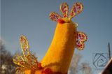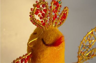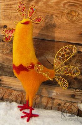 Высота Золотого Петушка 25 см, ширина 19 см, толщина 11 см. Изготовлен из овечьей шерсти. Гребешок, бородка, крылышки и хвост выполнены из бисера на проволочном каркасе. Закреплены. Ноги на проволочном каркасе. На ровной поверхности без уклона стоит устойчиво. От тряски падает)) Исстари петуха почитали как солнечную птицу, «глашатая Солнца», именно поэтому у Золотого Петушка такой зазнавшийся вид))) Берегите от маленьких детей, так как игрушка имеет отрывающиеся детали.