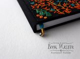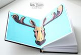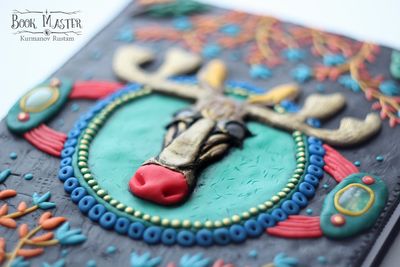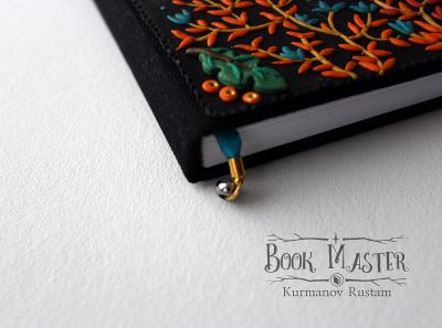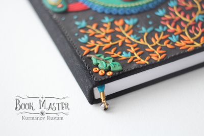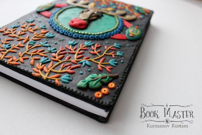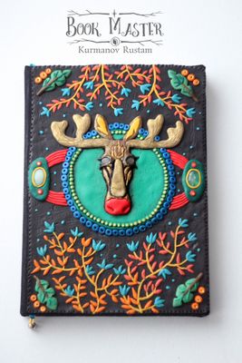 Книга ручной работы для записей "Золоторогий олень". 120 листов. Размеры 15х21 см. Материал: бумага белая, картон плотный, черная джинсовая ткань, нитки, металлические детали (фурнитура), пластик, акриловые краски, минерал - нефрит.